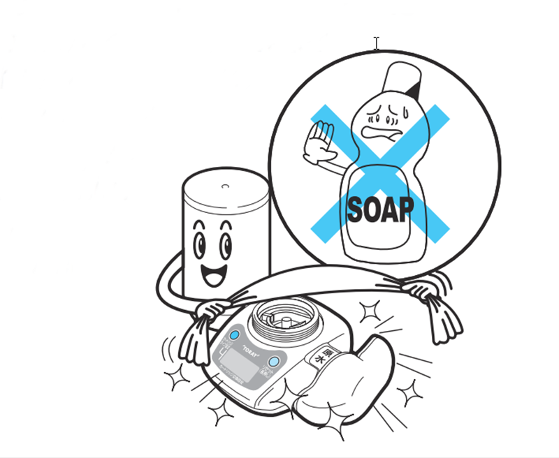 Khi vệ sinh thiết bị lọc nước Torayvino bạn không nên sử dụng các dung dịch tẩy rửa, vì các hợp chất này có thể dính vào phần nước chảy qua cửa xả, đồng thời có nguy cơ làm mòn sản phẩm. Do đó, việc làm sạch tốt nhất nên được thực hiện bằng vải ướt, vừa nhẹ nhàng, tiện lợi, lại tốt cho thiết bị nhà mình.