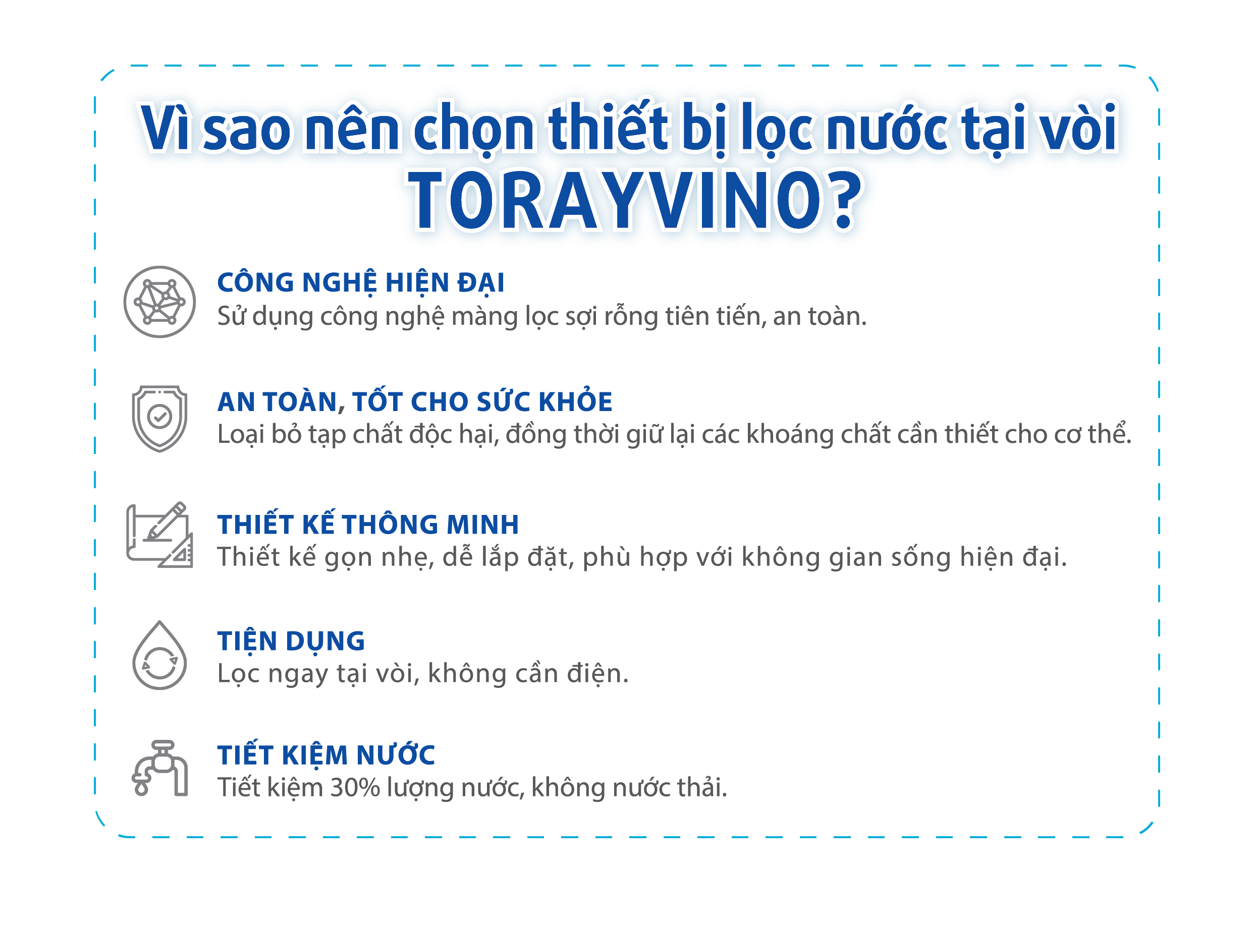 Thiết bị lọc nước tại vòi TORAYVINO ứng dụng công nghệ màng lọc sợi rỗng an toàn tuyệt đối trong lĩnh vực y tế, được công ty sản xuất và phát triển từ hơn 30 năm qua. TORAYVINO hiện dẫn đầu thị phần thiết bị lọc nước tại vòi ở Nhật Bản với hơn 100 triệu chiếc vào năm 2017 và đã có mặt ở 22 quốc gia trên thế giới như Nhật Bản, Hoa Kỳ, Thụy Sỹ, Singapore...