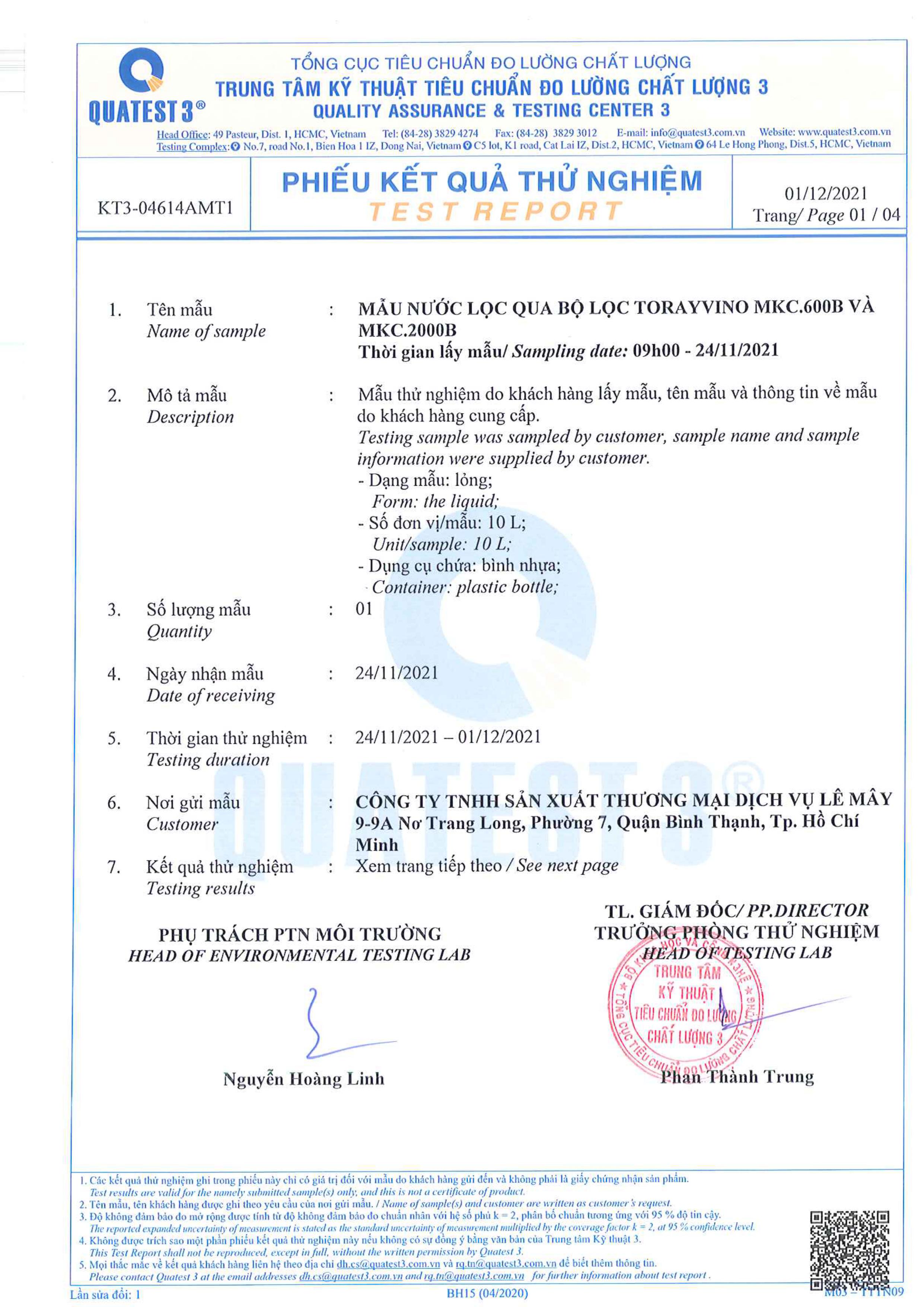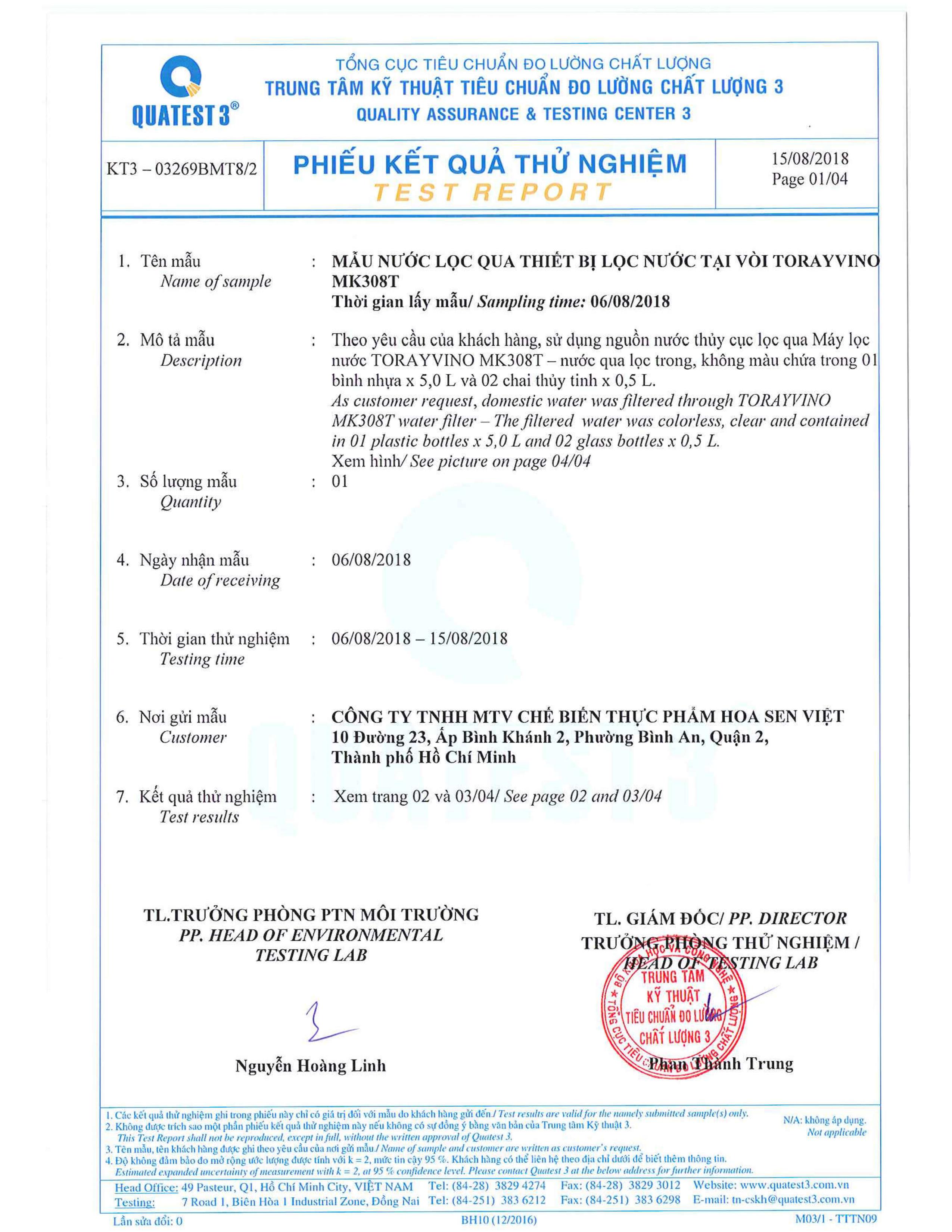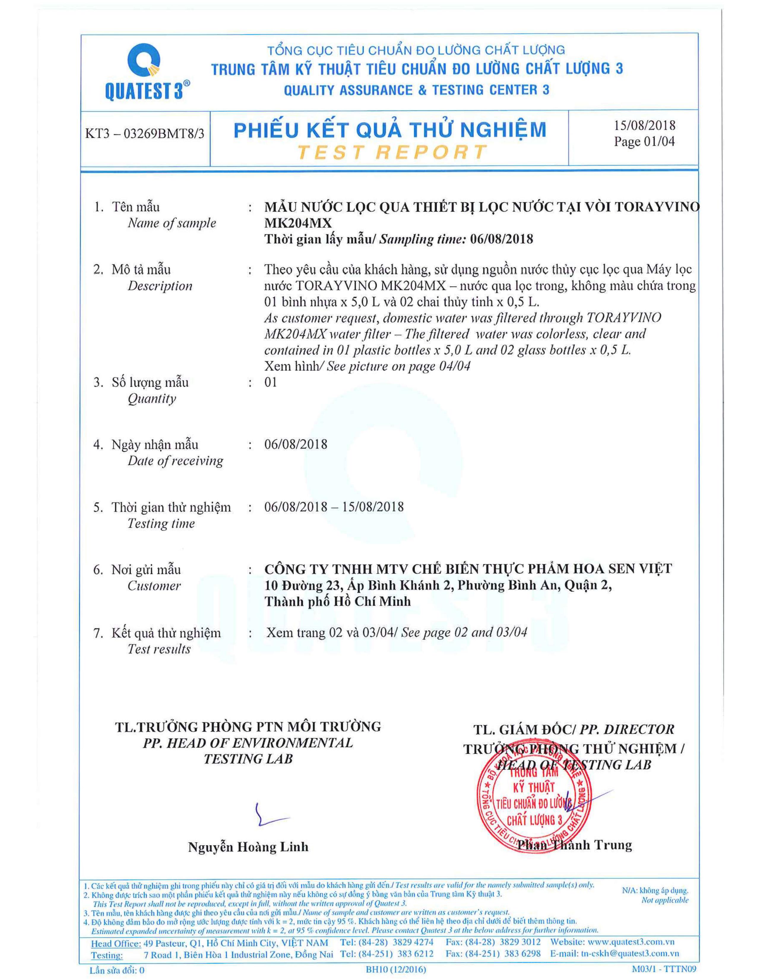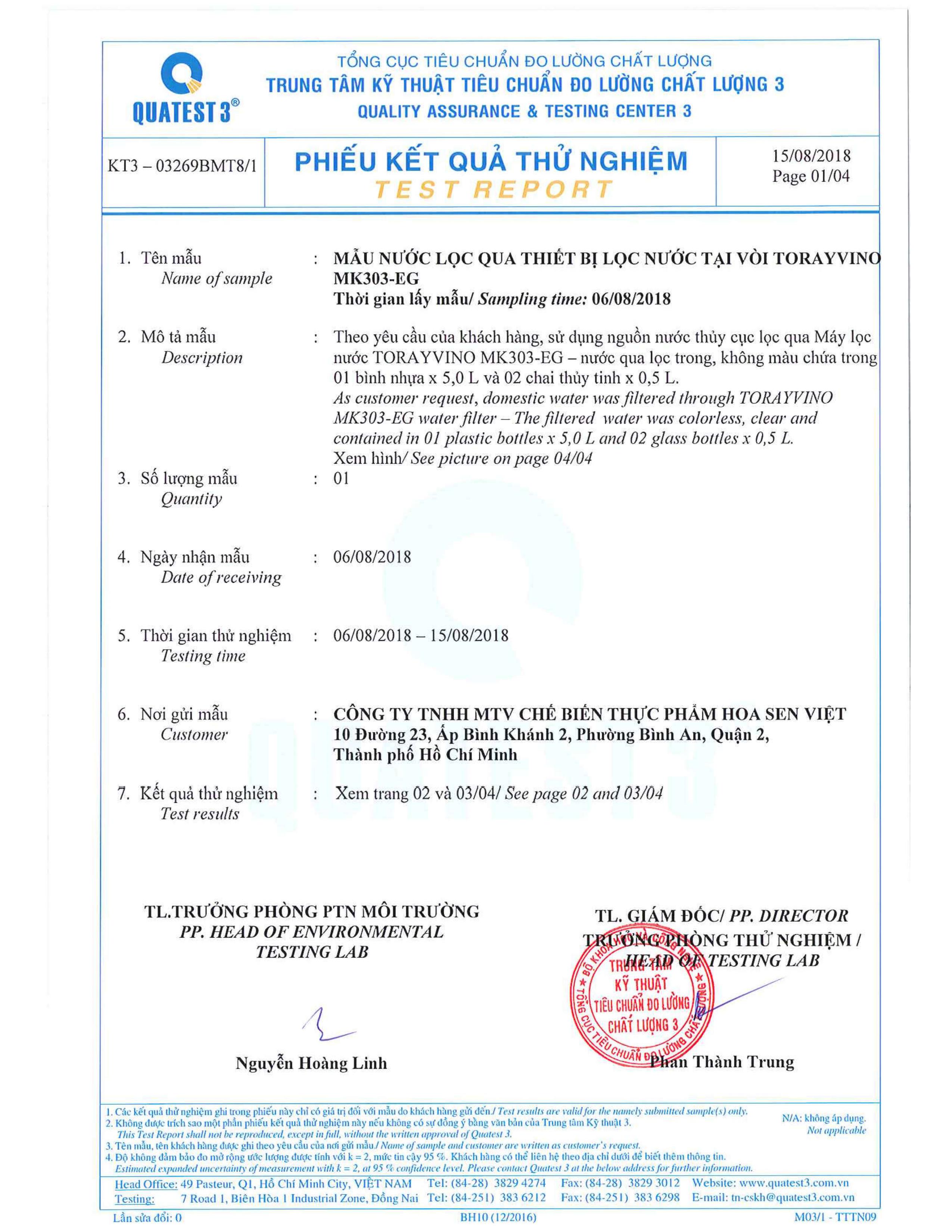 Để đảm bảo an toàn cho thể chất của người Việt, Torayvino đã chuẩn hóa nguồn nước sau khi lọc bởi các thiết bị lọc bằng các Kết quả thử nghiệm uy tín tại thị trường Việt Nam.