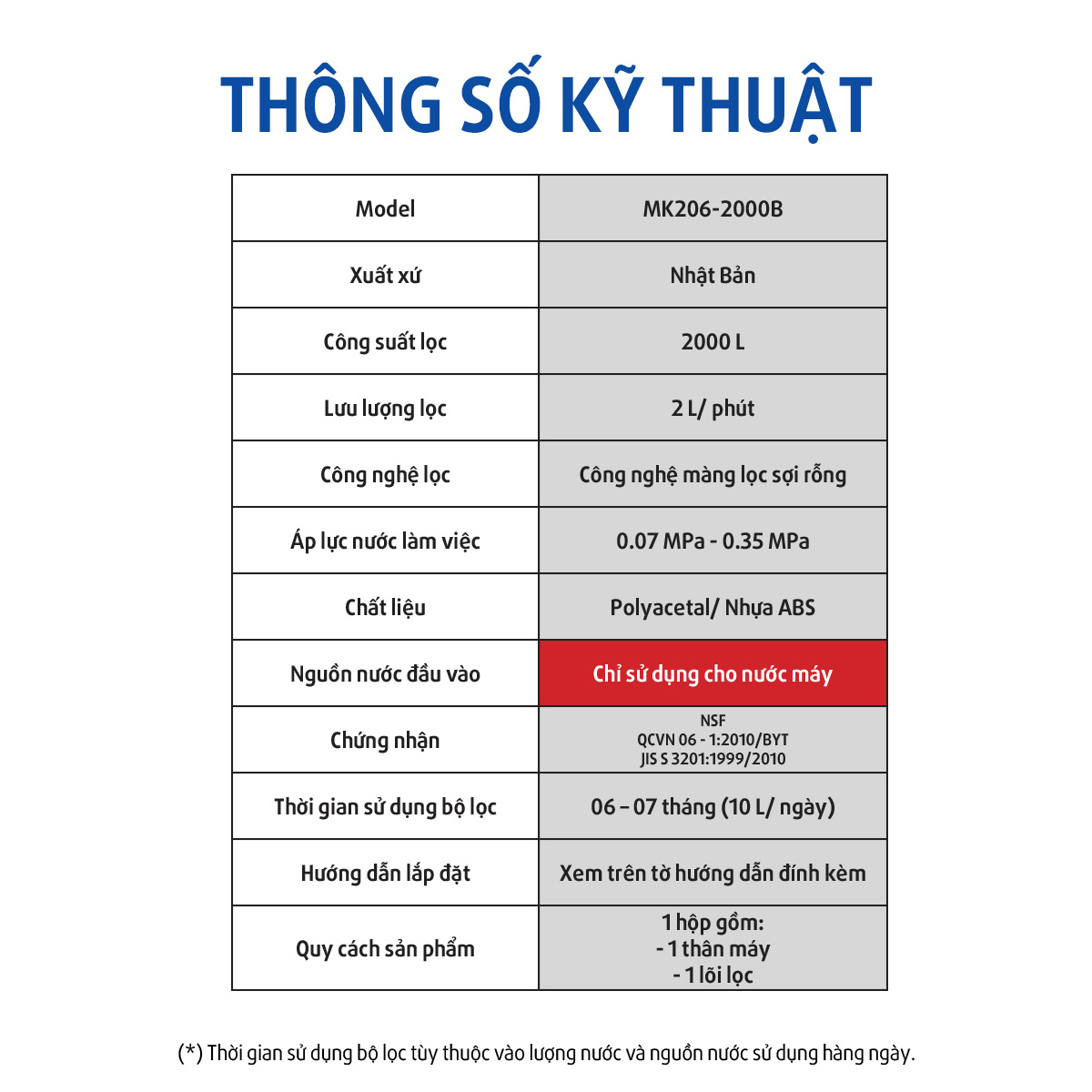 (*) Thời gian thay lõi còn phụ thuộc vào chất lượng nước đầu vào và lượng sử dụng thực tế của gia đình