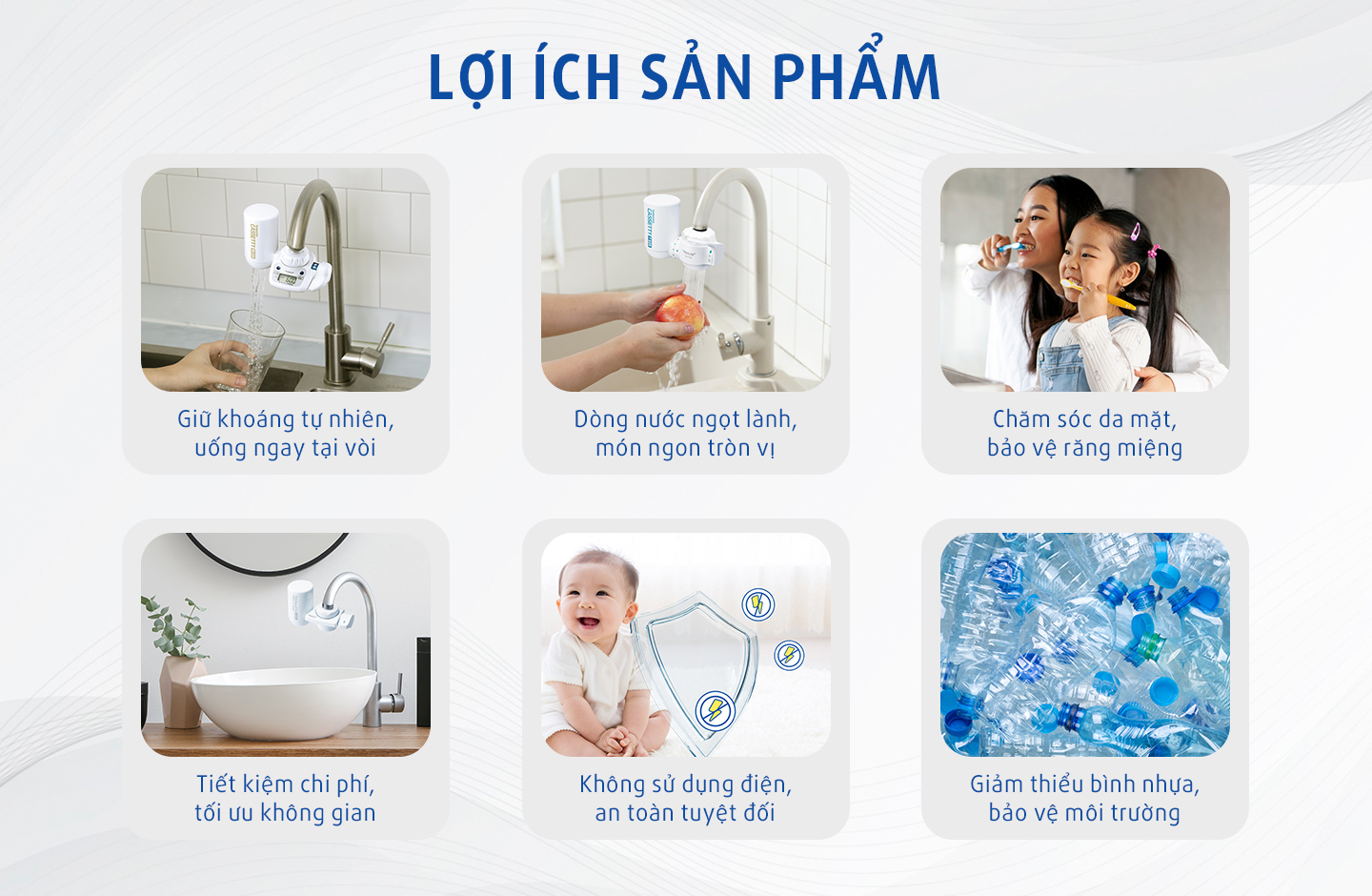- Công nghệ màng lọc sợi rỗng qua 4 cấp lọc, loại bỏ 99.9% vi khuẩn và tạp chất, giữ lại khoáng chất có lợi